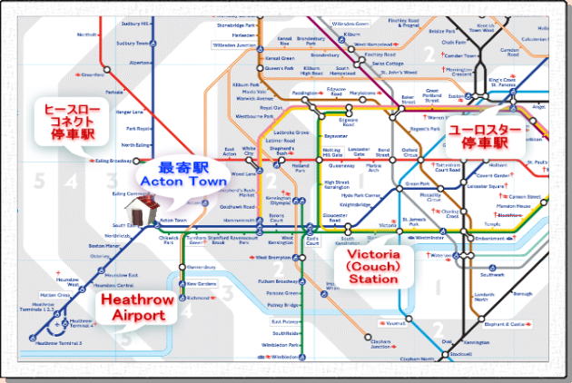 @ Heathrow Airport駅 ―(地下鉄ピカデリー線 35分)― Acton Town駅 |