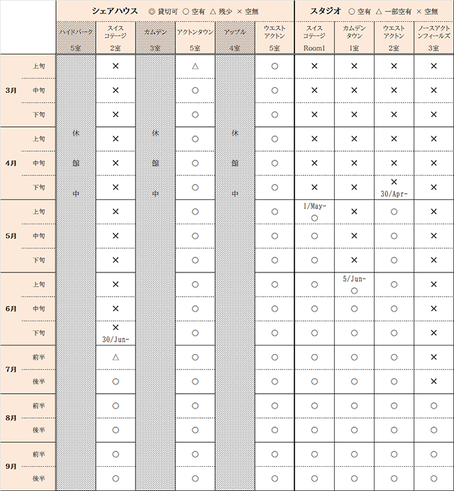 この表は空室状況の目安の提供を目的としています。様々な事情から、大まかな表示、数日間隔の更新になります。