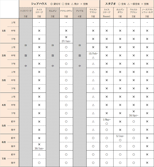 この表は空室状況の目安の提供を目的としています。様々な事情から、大まかな表示、数日間隔の更新になります。
